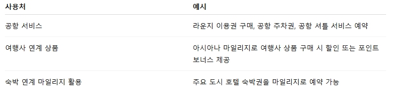 -제휴 신용카드 포인트 전환: 일부 신용카드 적립 포인트를 아시아나 마일리지로 전환하거나, 반대로 마일리지를 카드 포인트로 전환해 제휴사에서 사용할 수 있습니다.