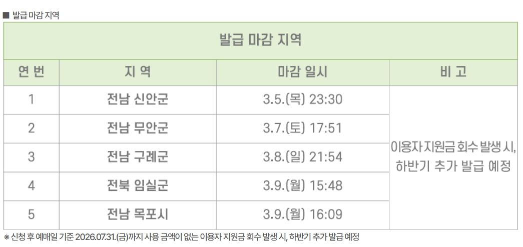- 신청 후 예몌일 기준 26년 7월 31일까지 사용금액이 없는 이용자 지원금 회수(재신청 불가)