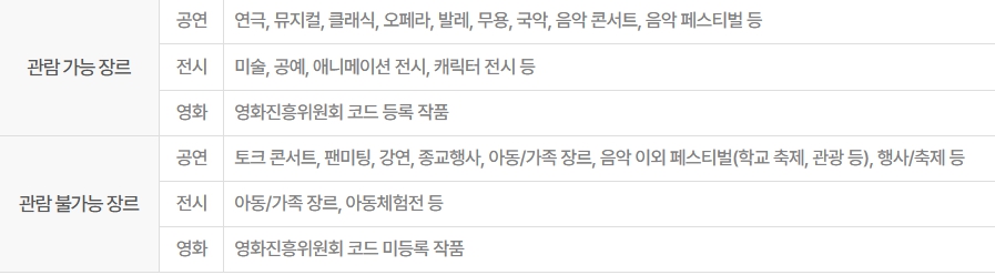 - 영화 분야는 수도권(서울,경기,인천) 2회, 비수도권 4회로 관람 횟수 제한