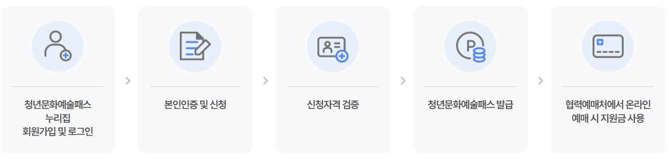 마이페이지에서 청년 문화예술패스 메뉴를 선택하고, 생년월일과 연락처를 입력합니다. 추가 서류 제출 없이 온라인으로 즉시 신청이 완료됩니다.