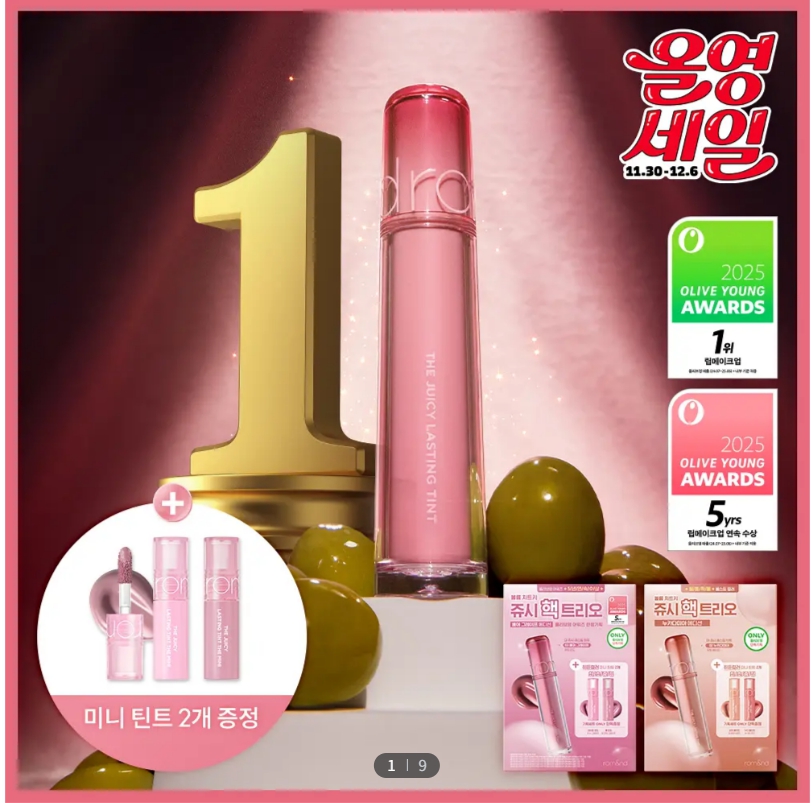 4년 연속 올리브영 어워즈 색조 부문 1위에 오른 인기 틴트입니다. 맑고 촉촉한 과즙광 표현이 특징이며, 컬러 선택 폭이 넓어 세일 기간에는 2~3개 이상 색상별로 구매하는 소비자가 많습니다. 마스크·건조한 환경에서도 잘 지속되어 일상용 데일리 립으로 인기입니다.