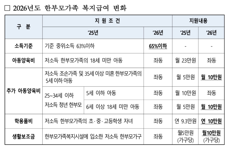 2026년 한부모가정의 복지 예산 편성이 늘어남에 따라 양육 지원이 확대 강화 되었습니다.